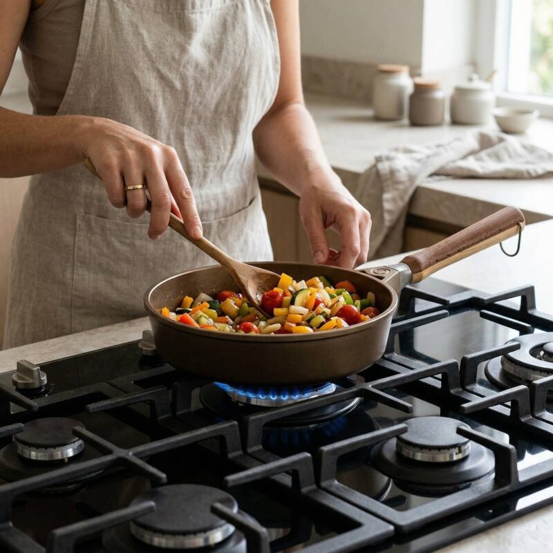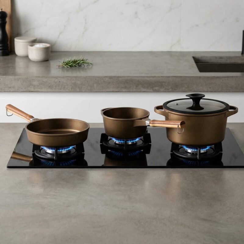 De pannen zijn opgebouwd met een stevige 6,5 mm aluminium bodem. Daardoor warmen ze vlot op en verdelen ze de hitte gelijkmatig. Dat betekent: rustiger koken, minder hotspots en een consistenter resultaat—ook als je op een drukke doordeweekse avond niet in de mood bent om chef te spelen.