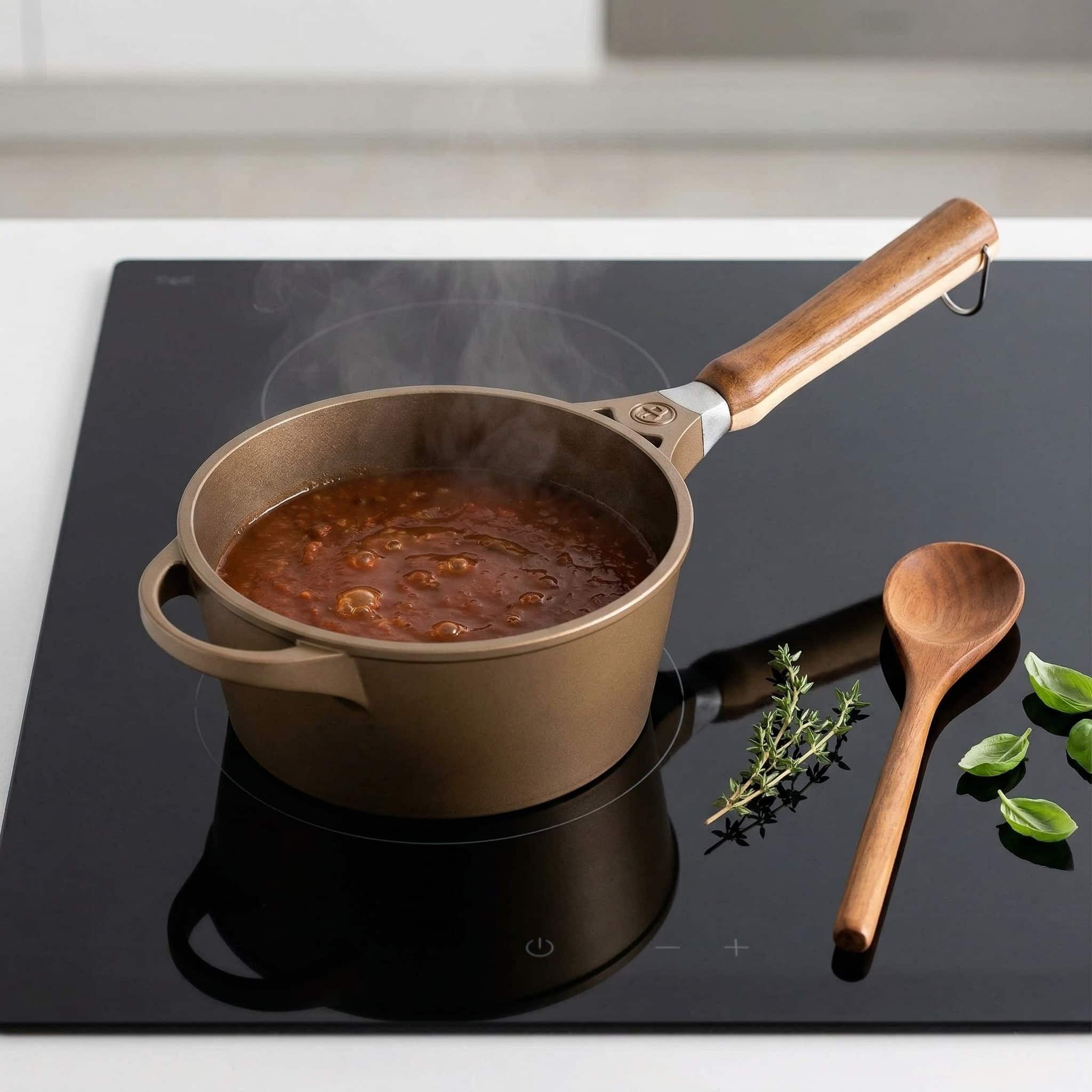 Bij het maken van sauzen draait alles om controle. De 6,5 mm dikke aluminium bodem verdeelt de warmte gelijkmatig, zodat je minder snel last hebt van aanbranden op één plek. Dat maakt roeren een stuk relaxter en je resultaten een stuk consistenter.