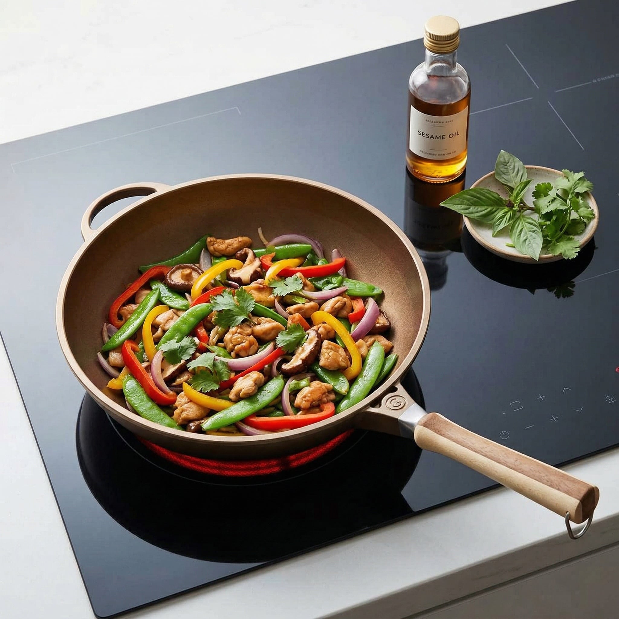 Een stevige bodem verdeelt warmte beter en houdt die stabieler vast. Zeker als je koude ingrediënten toevoegt, reageert de pan voorspelbaarder. Dat maakt het verschil tussen echt roerbakken en per ongeluk stoven.