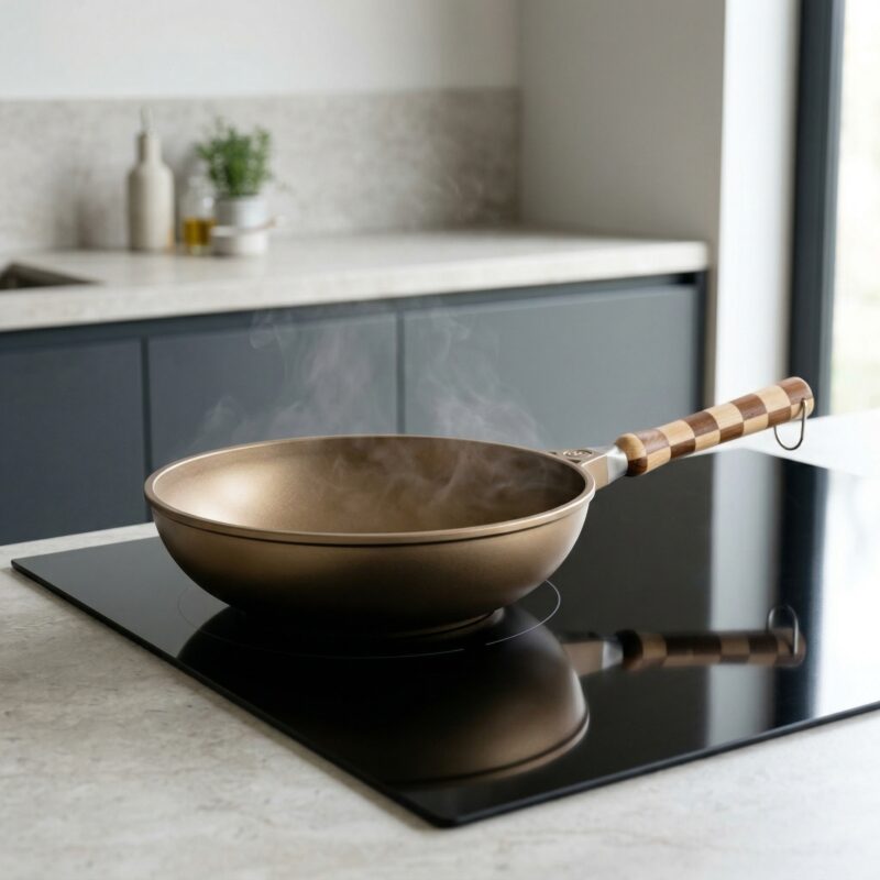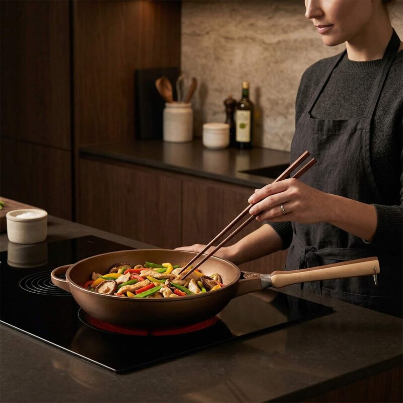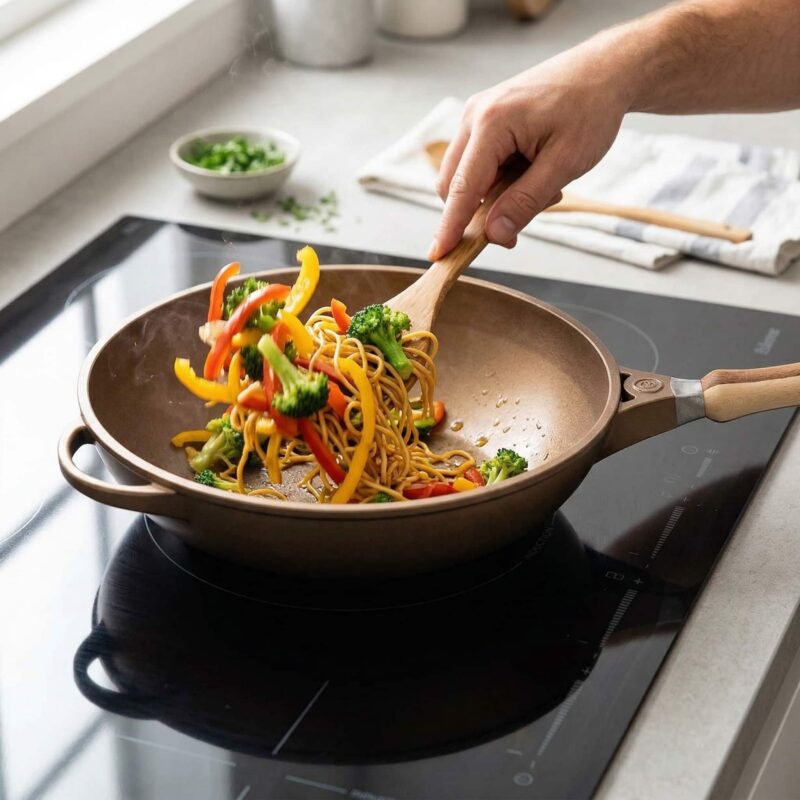 Een stevige bodem verdeelt warmte beter en houdt die stabieler vast. Zeker als je koude ingrediënten toevoegt, reageert de pan voorspelbaarder. Dat maakt het verschil tussen echt roerbakken en per ongeluk stoven.