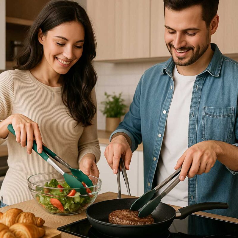 De tang is vervaardigd uit stevig RVS en voorzien van zachte, BPA-vrije siliconen uiteinden. Deze combinatie garandeert duurzaamheid, hittebestendigheid tot 230 °C en veilig gebruik op antiaanbaklagen, gietijzeren pannen of keramische schalen.