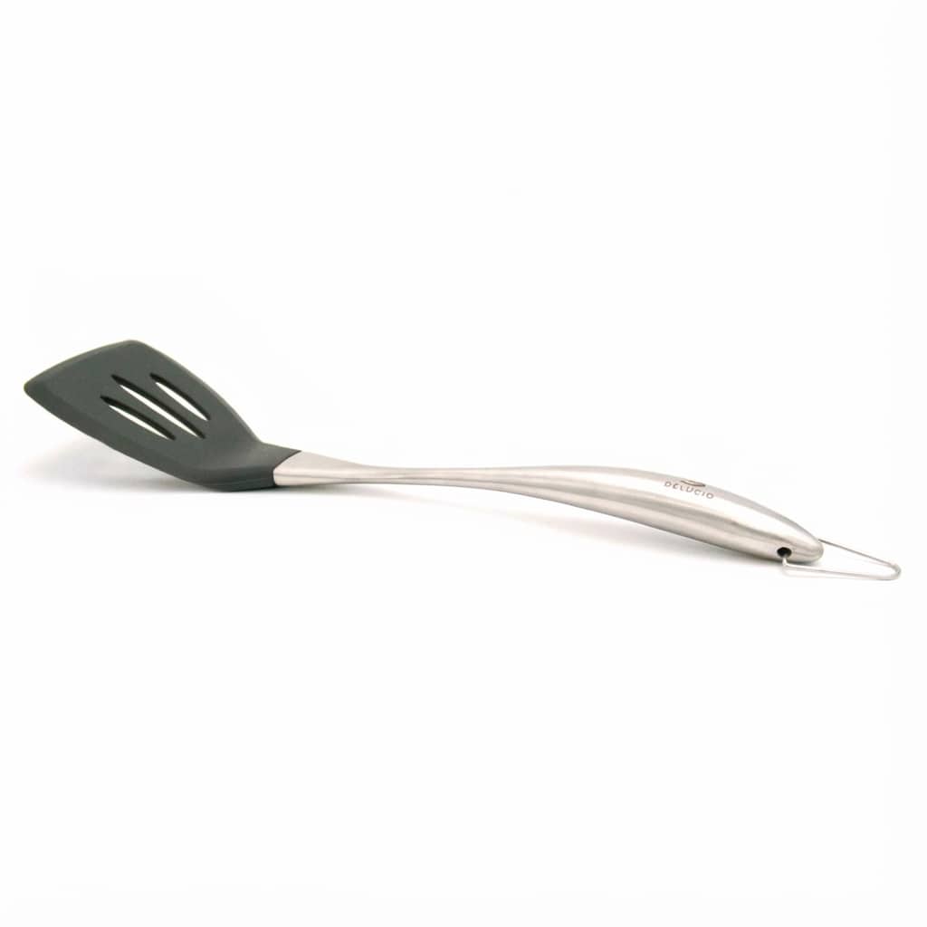 De RVS / Siliconen Gegleufde Bakspaan Groen is een veelzijdig keukengerei dat onmisbaar is in elke keuken. Dankzij de gegleufde structuur kun je gemakkelijk overtollig vet of vloeistof laten weglopen, waardoor deze spaan ideaal is voor het omscheppen van gebakken of gefrituurde gerechten. Het ergonomische handvat van roestvrij staal biedt een comfortabele grip en zorgt voor een lange levensduur.