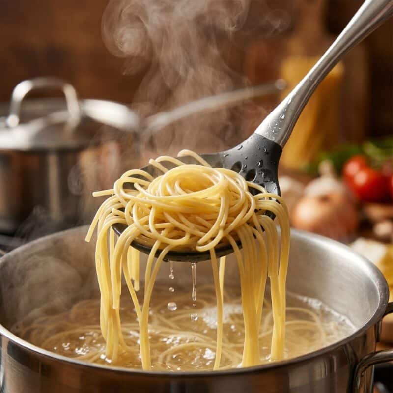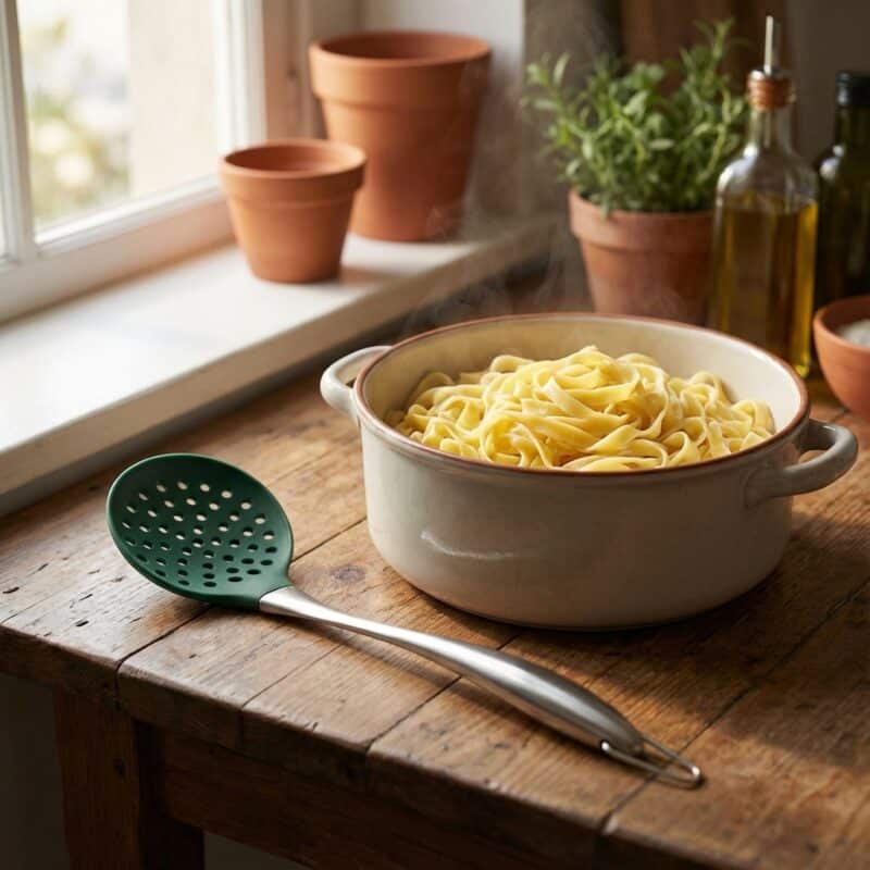 De RVS / Siliconen Vergiet Spaan Groen is een onmisbare keukentool voor het veilig en gemakkelijk opscheppen van pasta, vooral spaghetti, rechtstreeks uit kokend water. Het ergonomisch ontworpen roestvrijstalen handvat zorgt voor een stevige en comfortabele grip, terwijl het hoogwaardige, voedselveilige siliconen materiaal ervoor zorgt dat je pannen niet beschadigd raken.
